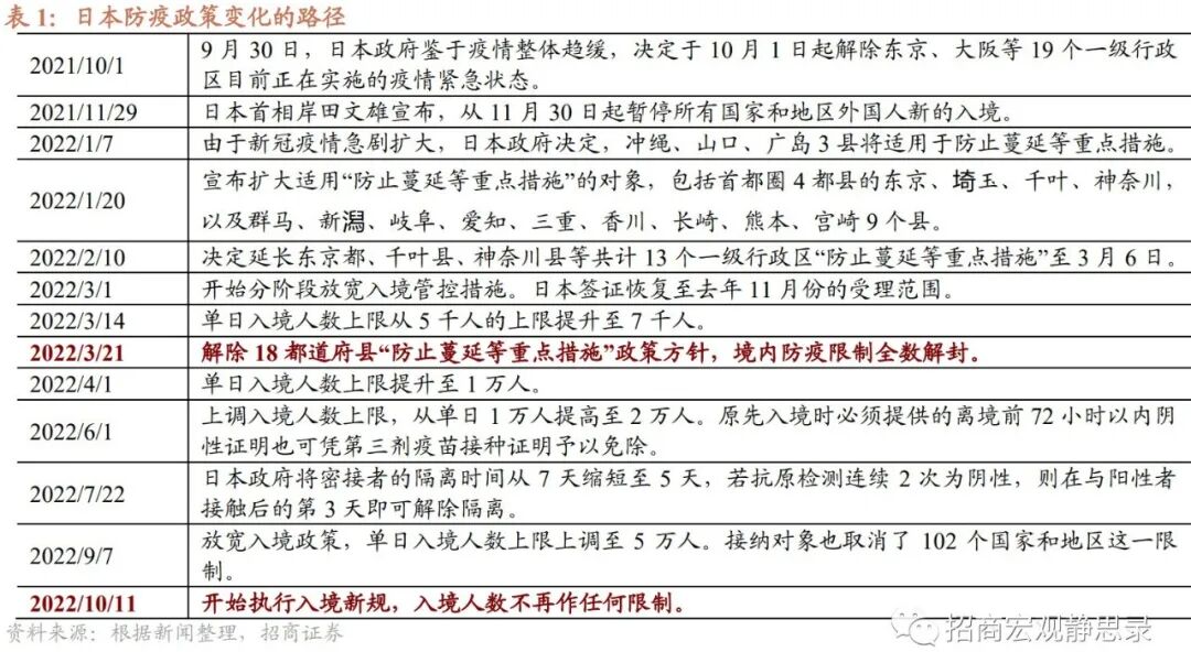 (四)日本股市震荡收涨,医疗、必选和能源具有相对收益3月日本国内放开后股市震荡偏强,结构性特征显著。10月放开入境限制后股市单边上涨。3月21日到11月18日,日经225指数上涨4.0%。结构上,医疗表现最佳,必选和能源次之,材料和科技表现最差。3月21日到11月18日,行业表现的排序为医疗(21.9%)>必选消费(9.5%)>能源(8.5%)>通信设备(4.5%)>金融(1.6%)>工业(1.5%)>公共事业(1.2%)>可选消费(0.5%)>科技(-0.6%)>材料(-5.2%)。1月日本10年期国债收益率快速上行,国内防疫放开后债市震荡走平。防疫放开后,美联储持续紧缩而日央行维持宽松,叠加能源危机导致的贸易逆差,美元兑日元汇率持续贬值。二、韩国:防疫“躺平”后生产和消费下滑,财政货币边际收紧今年1月起韩国逐步放松防疫。2月18日韩国中央灾难安全对策本部调整防疫措施具体方案,延长餐厅、练歌房、室内体育设施等公众场所营业时间,停止营业场所出入名单登记制度。4月15日,韩国国务总理宣布从4月18日起全面解除社交距离措施;4月25日新冠传染病等级从甲级下调至乙级,防疫开始转为“躺平”。6月20日起韩国取消新冠患者隔离要求。出入境方面,今年4月1日起,完成全程新冠疫苗接种的入境者免隔离;未接种者入境后隔离7天;6月8日起,全面解除入境隔离限制 ,所有入境人员无论是否接种新冠疫苗、不分国籍,当天起一律免隔离。![]()