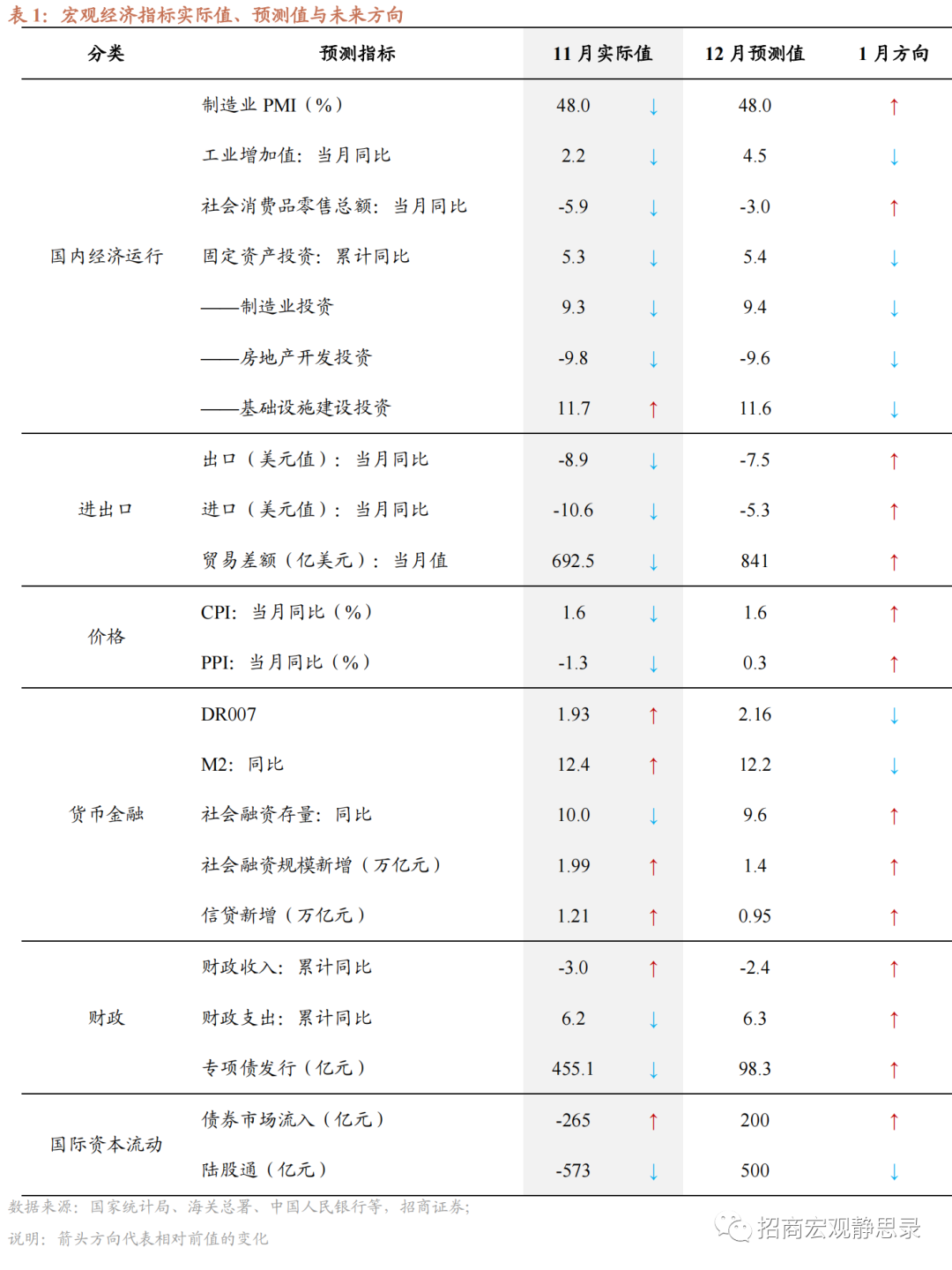 从领先指标来看,韩国12月前20日出口增长依然为负,具体值为-8.8%(11月前20日出口增长-16.7%),美国11月Markit制造业PMI继续居于枯荣线以下,具体值为46.2,相比11月进一步下降(前值为47.4)。另外,出口集装箱运价指数(CCFI)持续下行一定程度上反应了全球贸易市场的萎靡。12月份,海外需求市场持续萎缩的概率较大,这也说明我国出口面临的阻力依然较大。