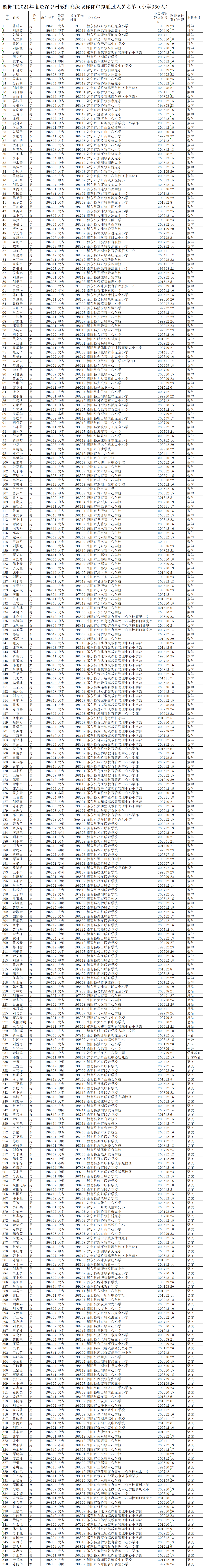 衡阳市2021年度基层中小学教师系列资深乡村教师高级职称评审工作已结束,现公示评审拟通过人员名单。公示期:2022年7月27日至8月2日。