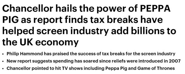 而不仅有《小猪佩奇》为英国吸金无数,英国财政大臣表示,去年,在影视业税收减免的优惠政策下,以《权力的游戏》(Game of Thrones)、《敦刻尔克》(Dunkirk)等为代表的英国影视产品为财政部带来20亿英镑的额外收入。