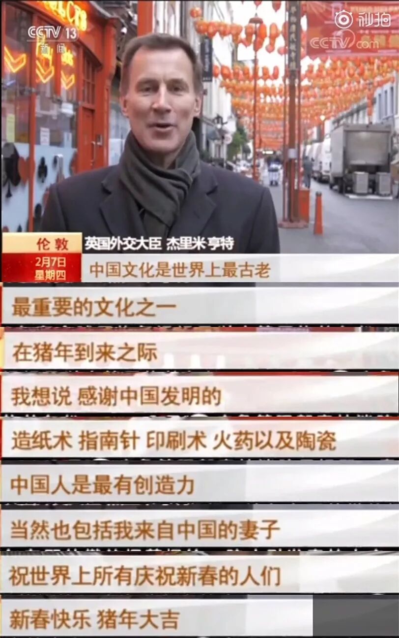 中国新年之际,亨特在伦敦的中国城前给中国人民拜了个年,还猝不及防地给大家撒了一波“狗粮”。