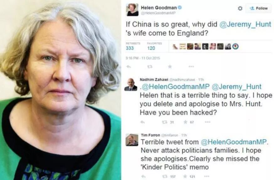 工党议员海伦·古德曼更是在推特上发文讽刺她:“如果中国这么伟大,为什么杰里米·亨特的妻子要来到英国?”