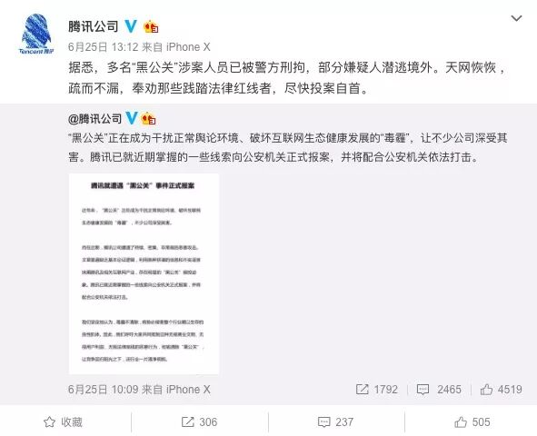 腾讯称:据悉,多名“黑公关”涉案人员已被警方刑拘,部分嫌疑人潜逃境外。天网恢恢 ,疏而不漏,奉劝那些践踏法律红线者,尽快投案自首。