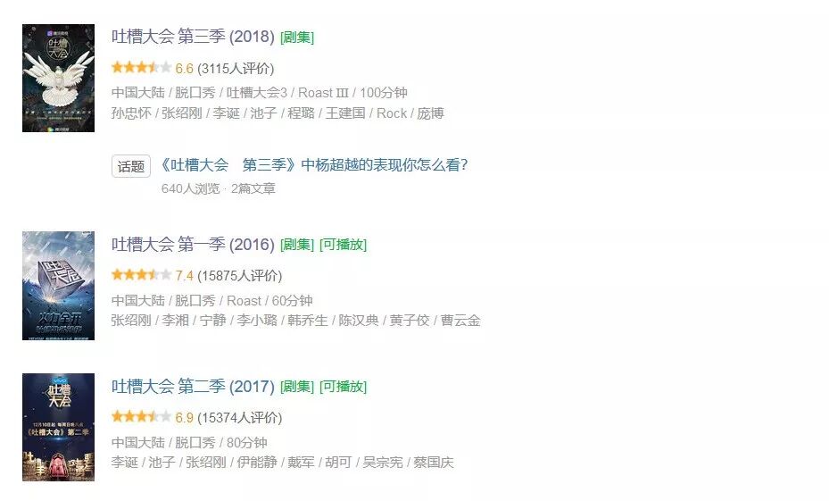 在豆瓣里,《吐槽大会》第三季的评分为6.6分,成为三季以来评分最低的一季。《吐槽大会》难道也陷入了综艺的第三季“扑街”魔咒?