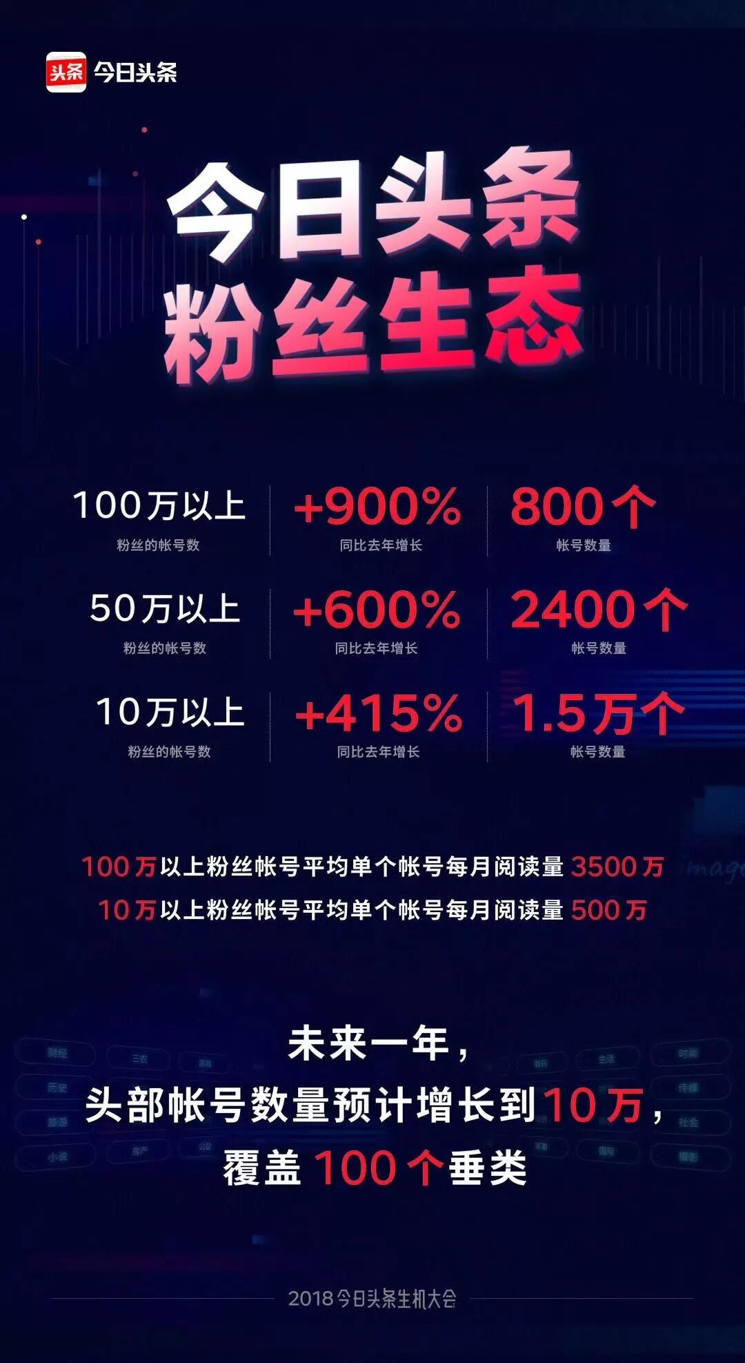 他透露,今日头条内容生态里并不只是头部账号繁荣,50 万以上粉丝帐号数量达到 2400 个,10 万以上粉丝帐号数量达到1.5万个 。这1.5万个帐号,平均每个帐号每月阅读量在 500 万以上,影响力很大。