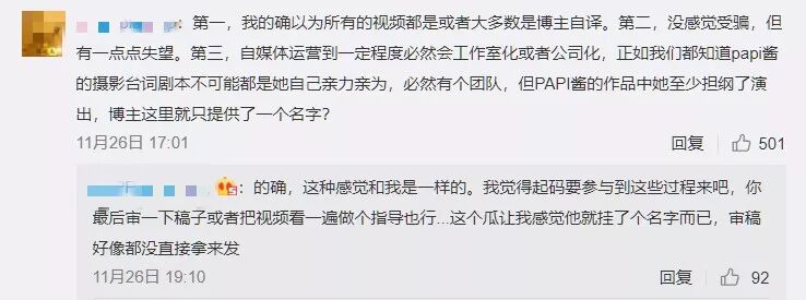 这条微博发出后,很多粉丝都觉得自己被骗了,因为他们一直认为,谷大发布的所有视频都是由他本人翻译的,因为谷大从来没有公开表示过自己有聘请过助手,在发布的视频里,署名也是谷大白话,而没有其他人或组织的署名。
