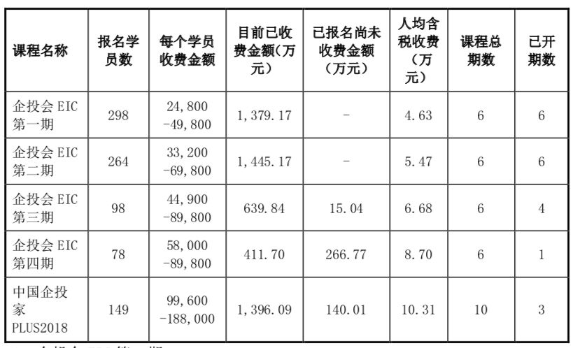 企投家EIC办了四期,共有1476人报名,学费从第一期的24800元涨到了第四期的58000元;总收入在变低,学员报名数逐渐变少,第一期收入了1379.17万元,第四期拿到了411.70万元。