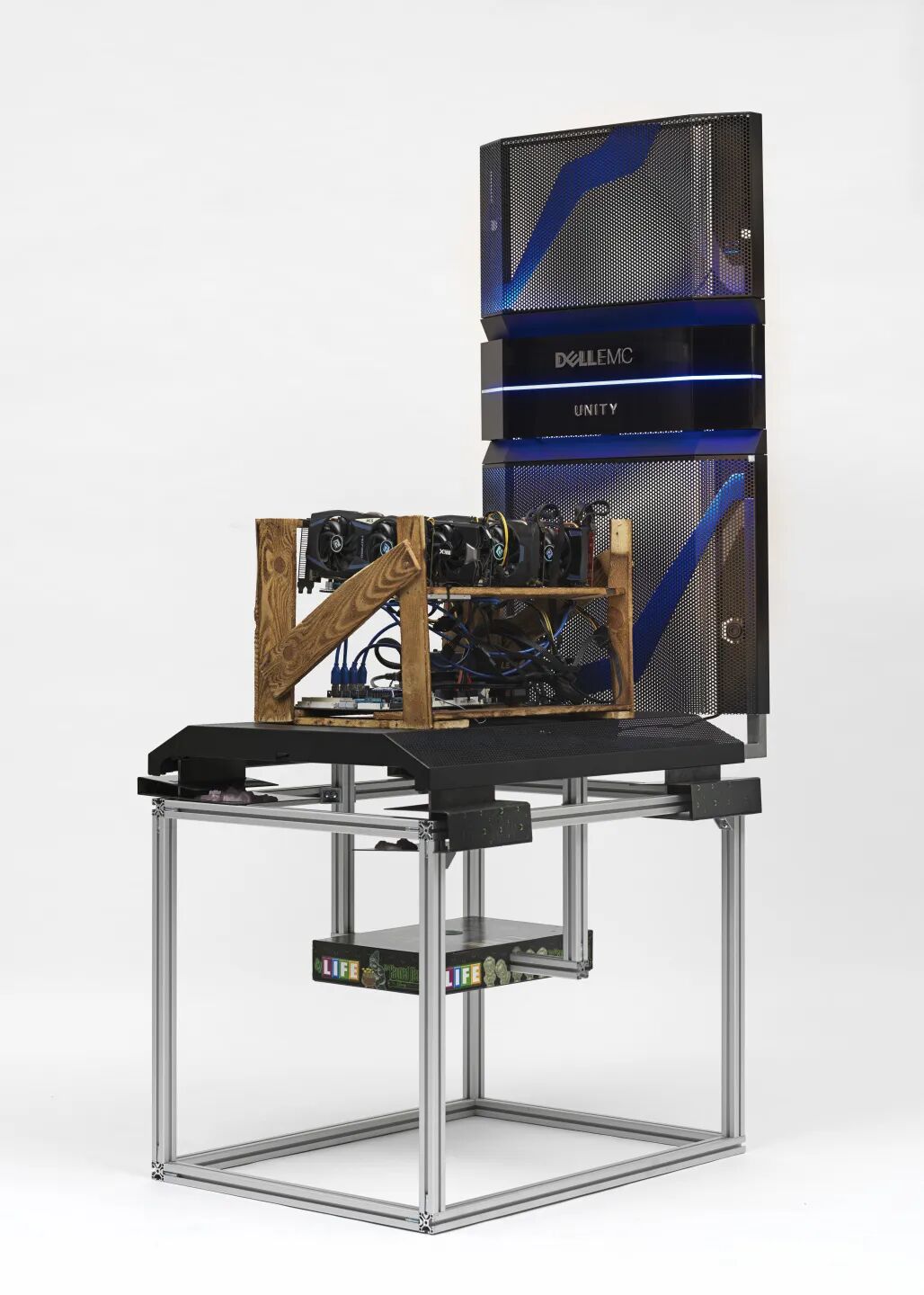 一组地面雕塑让构建中心化和去中心化网络的各种关键硬件元素互相隔绝,却又形成接合。图形处理单元(原来用于PC游戏中大量的图形处理工作,后来常用于“挖矿”瓦特币和其他加密货币, 因而成为新兴去中心化网络的基础设施)被安置在由“中心化”计算机硬件——超级计算机服务器机架——切割而成的“门”上。
