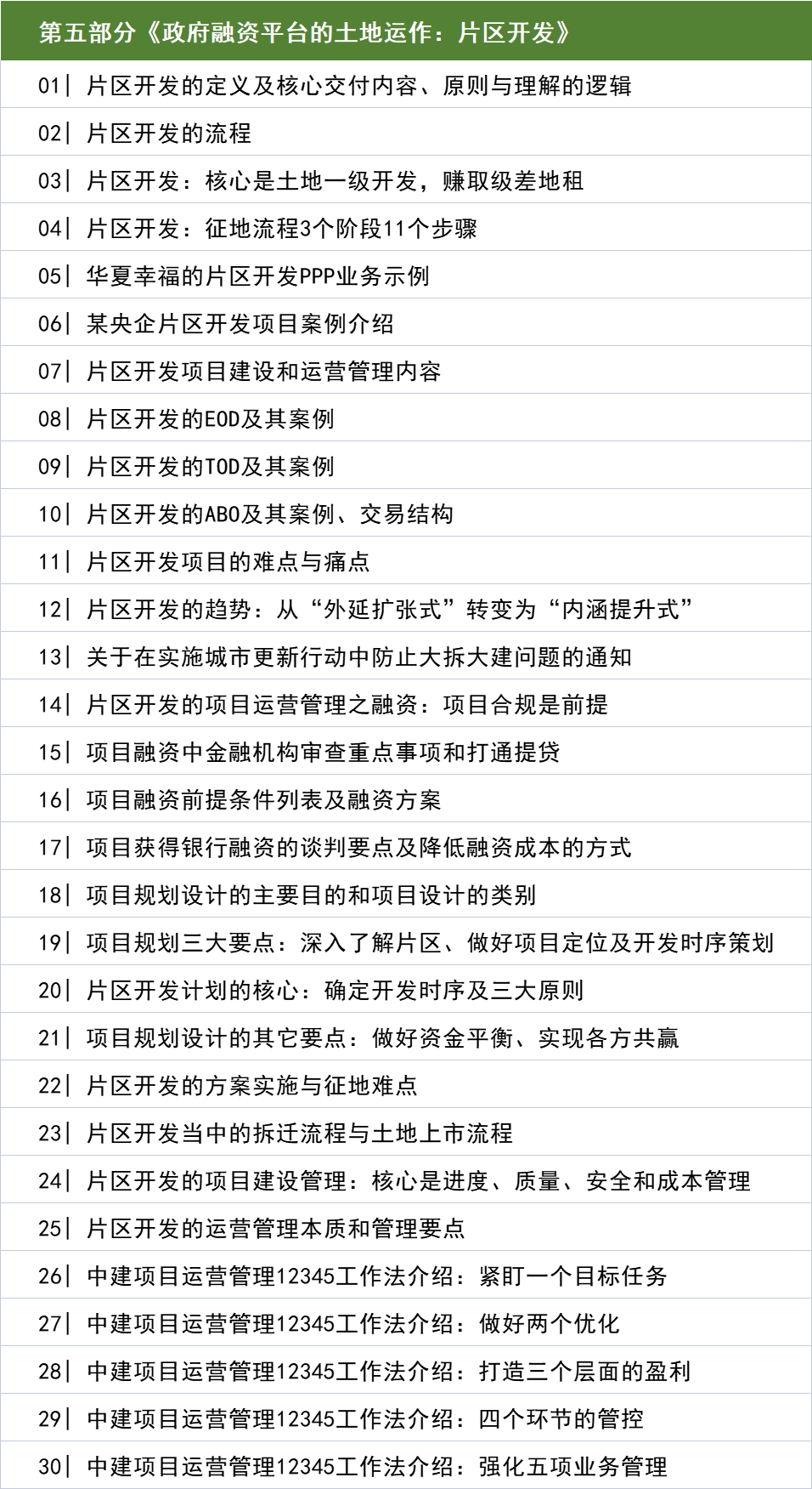 课程介绍了片区开发当中常见的PPP、ABO、EOD、TOD等概念、理解这些概念的关键是监管逻辑,即地方政府如何在各类法规监管、政策导向和举债受到限制的情况下,有利可图的进行片区开发。