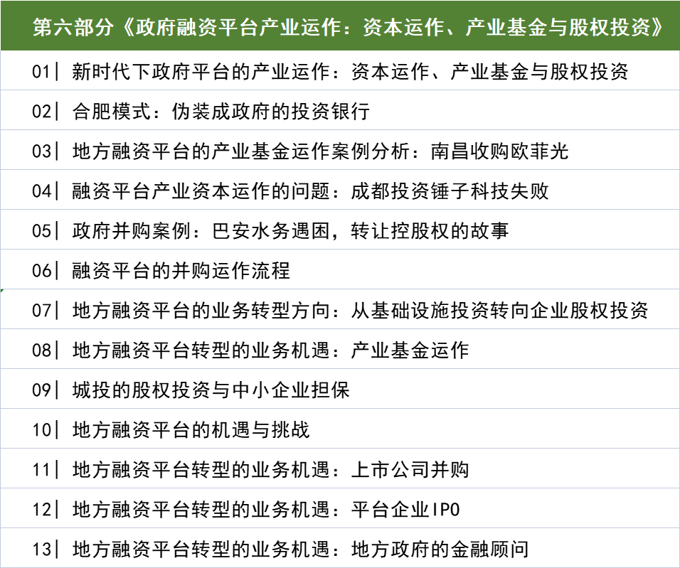 课程介绍了当前地方政府通过融资平台并购上市公司、创设产业基金、对上市公司关键产业进行投资并将产业引入本地、对于本地企业进行股权投资等等的资本操作。课程简要分析了南昌收购欧菲光案例、成都投资锤子科技案例、华夏幸福案例。