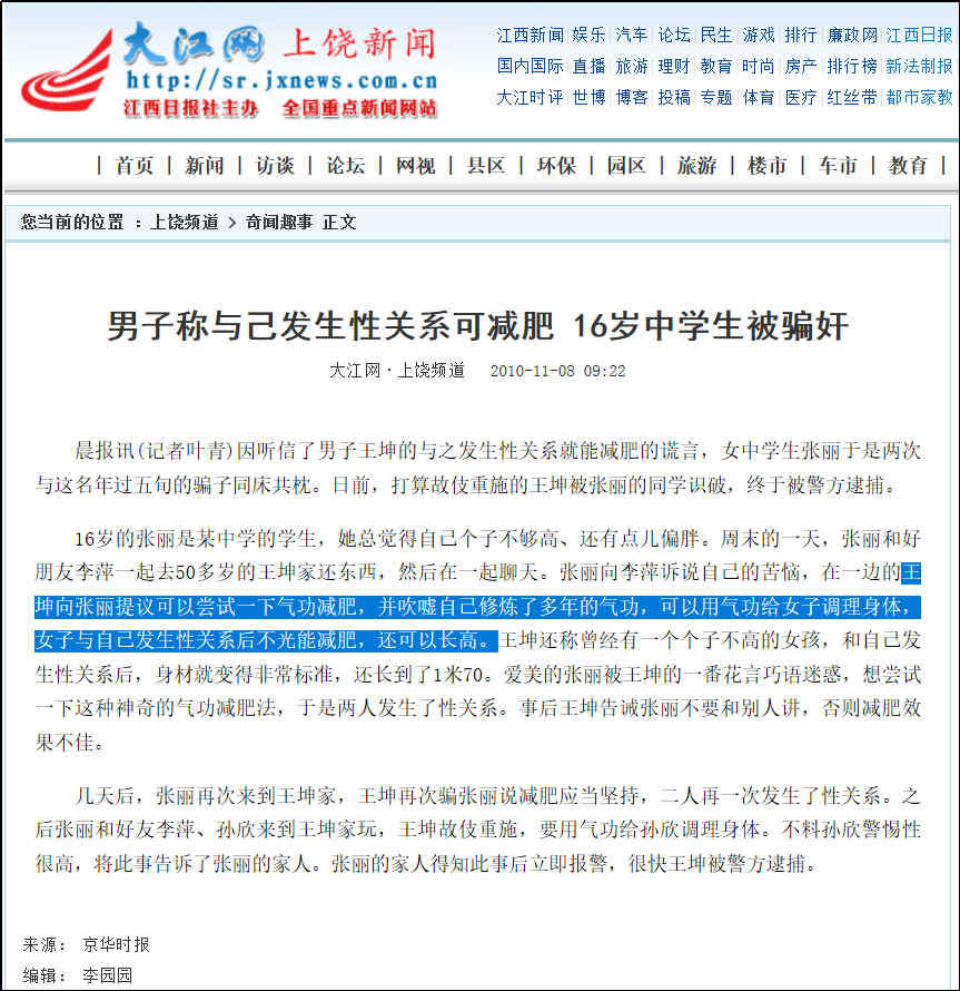 2010年,一名男子吹嘘自己修炼了多年的气功,可以用气功给女孩调理身体,和自己发生性关系后不光能减肥,还可以长高。