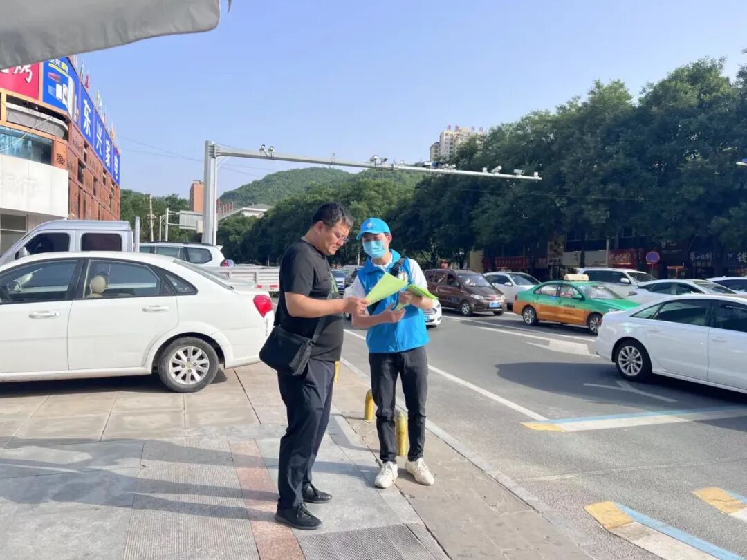 随后,志愿者们分布到尹家沟和东兴街两个路口四个方向,与执勤交警一起开展了为期两个小时的“缓堵保畅”文明交通劝导志愿服务活动。上午7点到9点的早高峰期时段,路口人来车往,路况紧张繁忙,烈日高悬在空中,地面温度逐渐升高,直射的阳光和地面的高温考验着志愿者们的意志。时间流逝,志愿者们依旧坚守在引导岗位上:身姿挺拔、姿势标准、引导积极、语气热情。蓝色的帽子和马甲、笔直的身影、阳光下微红的面孔,在人来人往的大道上形成了一道靓丽的风景线。