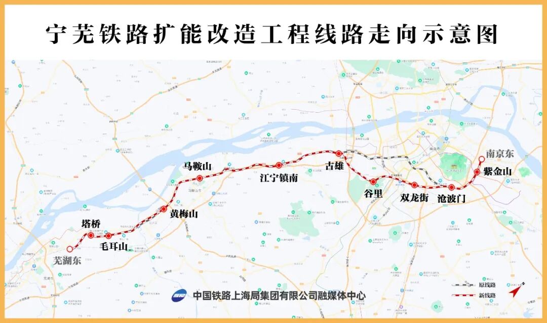 宁芜铁路扩能改造工程北起南京东编组站(不含),经南京市栖霞区、秦淮区、雨花台区、江宁区进入安徽省马鞍山市,过当涂县入芜湖市,终至芜湖东站(不含)。改建后线路全长102.2公里,其中南京城区沧波门站至古雄站段为新建外绕改线工程,线路长29.7公里;其余区段进行电气化扩能改造,改建后正线长度72.48公里。