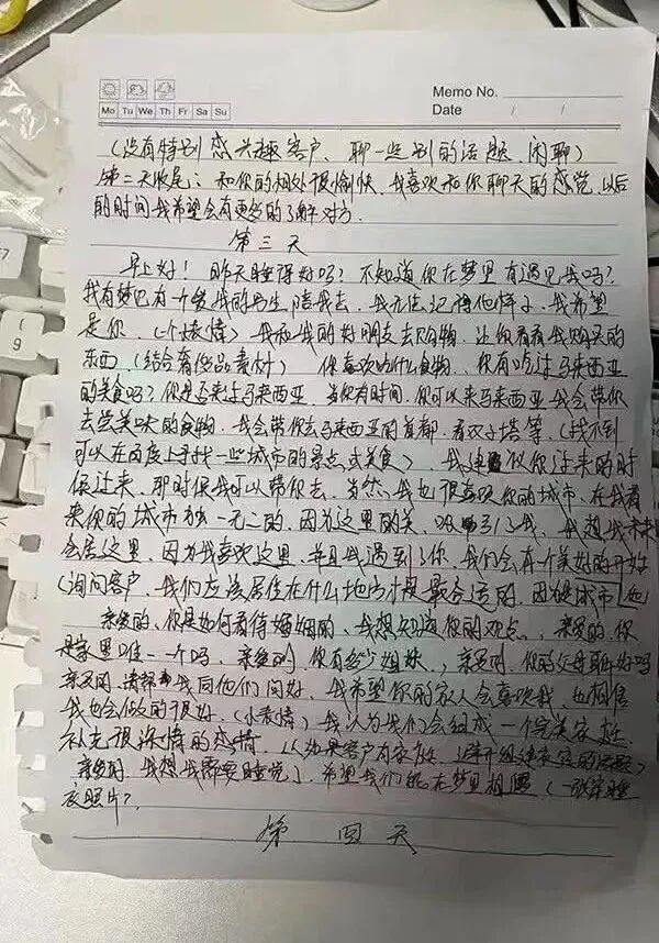遇上合适的诈骗对象,他们就迅速调动他们自己编写的“七天速战法”“拒绝视频聊天话术”“感情价值观话术”等话术,对网络彼岸沉浸在爱情中的外籍男性,发出一条又一条甜蜜蜜的情话。