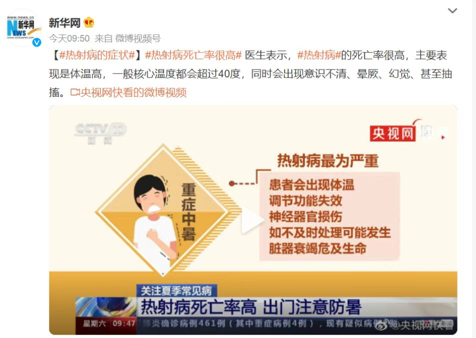 ▲ 多地出现热射病致死情况,媒体发布了相关科普信息。图 / 新华网微博