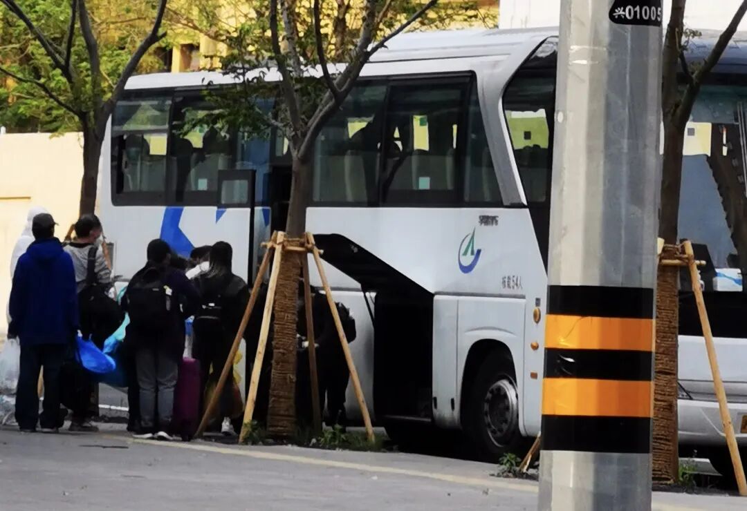 4月20日8时,一辆辆转运专班来到静安区北方商务大厦方舱医院,运送方舱内转阴人员出舱回家。出舱人员在领取《解除集中隔离医学证明》以及《解除集中隔离告知书》后,坐上该专班返回居住地接受7天的居家健康监测。