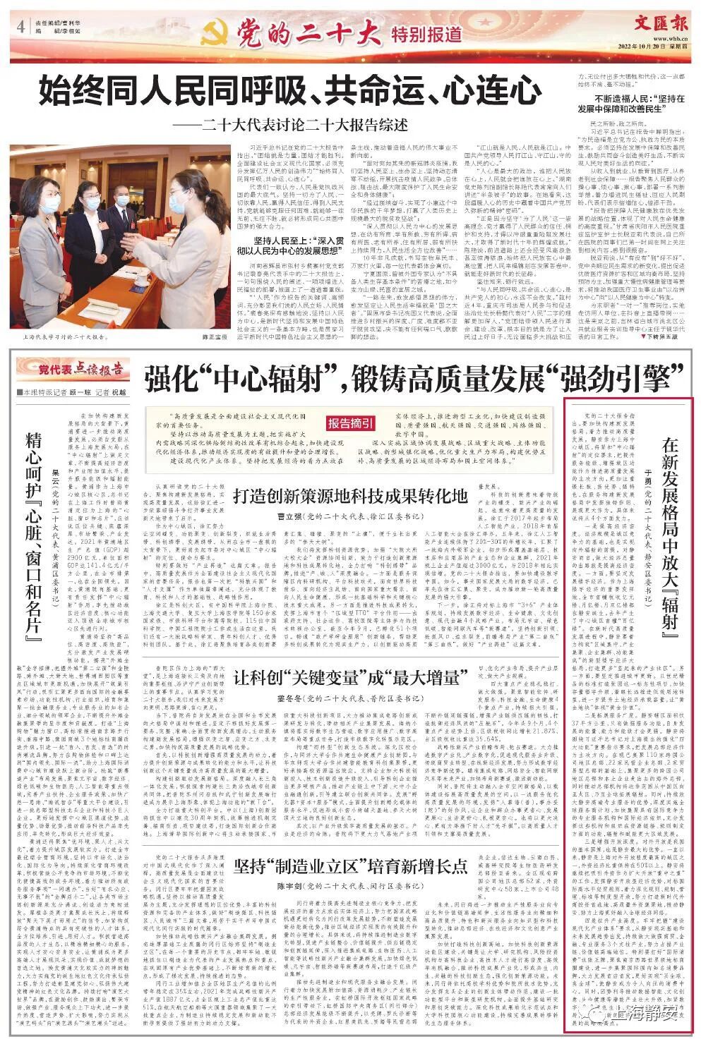 10月16日,中国共产党第二十次全国代表大会开幕。开幕会后,党的二十大代表、静安区委书记于勇接受文汇报记者采访,在文汇报今天(10月20日)的《在新发展格局中放大“辐射”》一文中,刊发了采访于勇的内容。