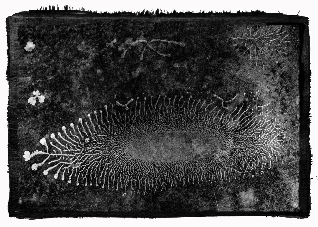 颜:《山海经 · 生花》看起来很是像胶片时代的铂金印相作品,其实也是数码相机拍摄的。除了为增强形式感,在照片四周做的铂金笔刷效果,画面里的其他内容都是实拍的。其实,这些“花”本是玻璃上的水蒸气,看“花”似“花”却不是“花”,所以我将作品定名为“生花”。这组作品我自己比较喜欢,其创作是一个发现潜藏在生活