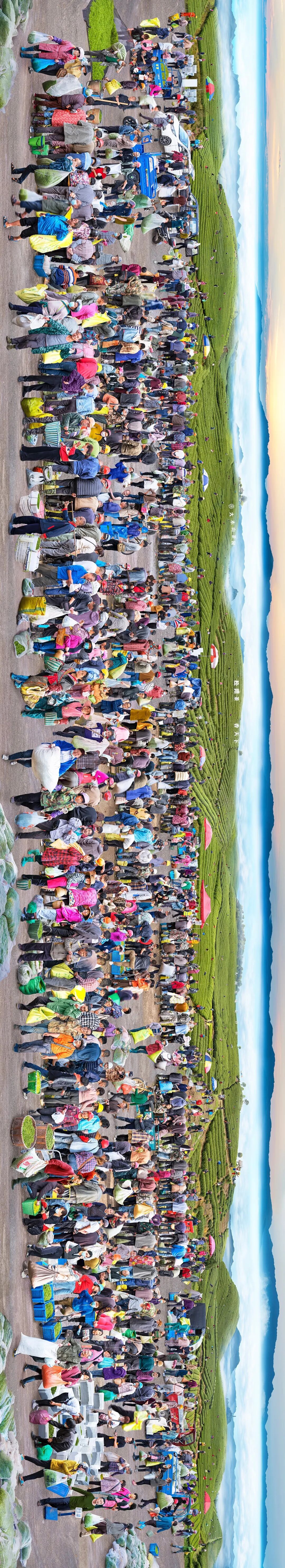 颜:开始这种长卷形式的创作之前,我已经积攒了不少作品。但是,展览一次只能呈现十多幅。同时,呈现一个故事或一个场景,也往往需要一组照片。为了打破这两种限制,我开始考虑以一幅作品概括式地同时呈现出多幅作品的内容,由此,开始了长卷形式的创作。当时参考了《清明上河图》,做散点透视。虽然基本方向没错,不过开始创作的时候非常困难,那些光影关系、色彩关系、比例关系、虚实关系、透视关系等等结合到一起非常复杂,做到半途就做不下去了。为了不出现任何美术上的瑕疵,需要数不清次数的反复推敲、反复调整。最后,我创作出了《向佛的脚步》这幅作品,展出时的