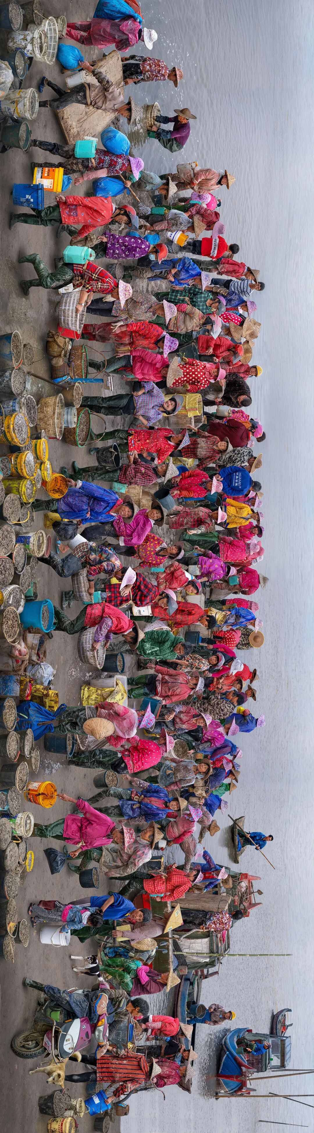 颜:我的父亲在县法院工作,母亲是农民。6 岁以前,我和母亲、爷爷、奶奶生活在温岭农村。母亲劳作之余,经常带着我步行十几里路,去海滩捡小海鲜。当时的海边环境很好,我跟在母亲身后,一边玩一边捡些贝壳、小螃蟹之类的食物。后来,父亲把我接到了教育条件更好的县城中生活,海滩上的童年就结束了。可是,这段记忆从来都没有淡去,经常在我的回忆中闪现。后来,海滩渐渐与我心目中的母亲形象与童年印象重合了。我想把对海滩的这种特殊情结表达出来,所以回到浙江后,我将镜头转向了家乡,拍摄一些反映家乡百姓与海滩相融共处的生活方式的作品。《赶海的女人们》是表现这一主题的最早的作品,后来,我还制作了一些长卷作品和直接摄影作品。现在,我在创作一些以家乡的乡村集市为题材的系列作品。把百姓多姿多彩的当代生活记录下来、表现出来,是我艺术创作的理想。