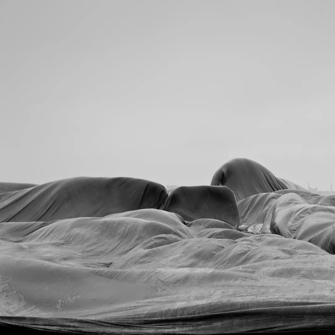 如果说《豪宅》系列呈现的是个体的肖像,那么《变海为陆》和《一号》系列则是群体的合照。陆地上的防尘布在风中如同海浪,这翻涌而来的不是自然的馈赠,而是人类对开拓疆土的无止境的欲望。密密麻麻的管道像一只只在烈日下曝晒的蚯蚓,毫无生气;又像一根根针管,直戳观者,引发不适甚至疼痛感。