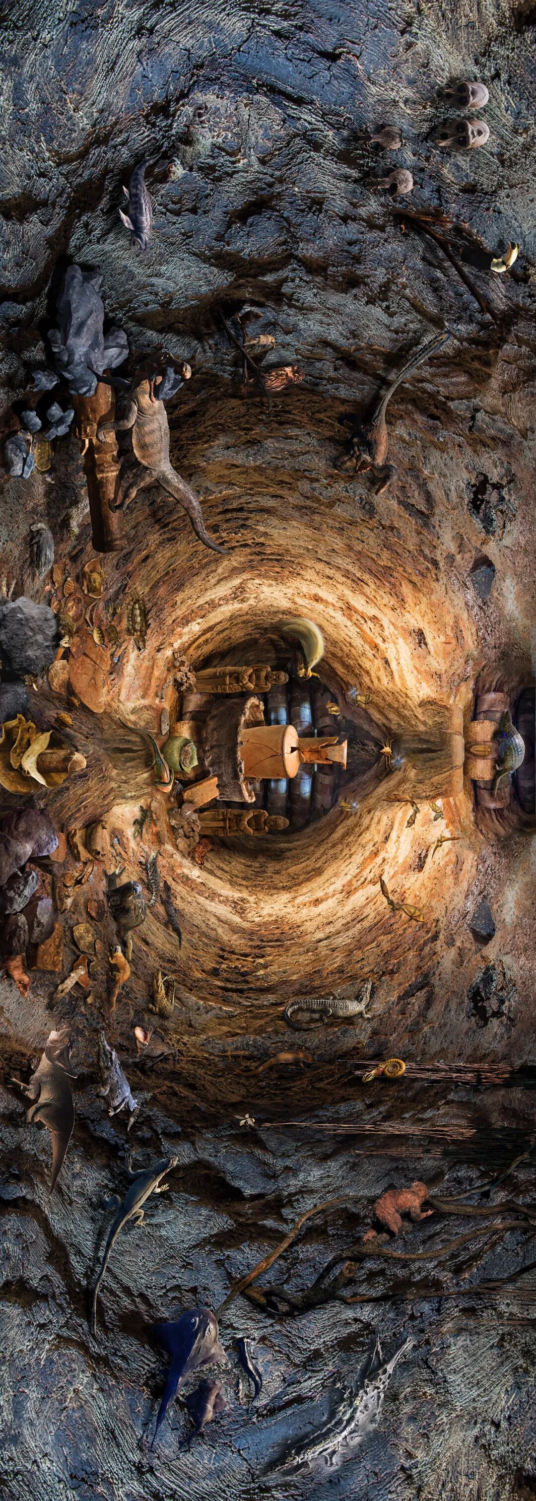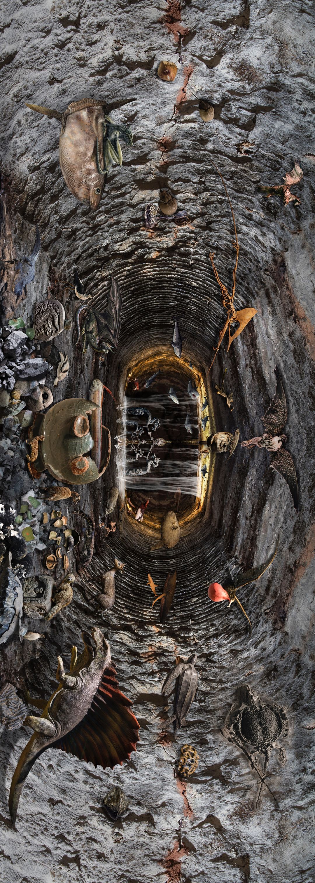 这种对时空的观望与想象在《窑系》中表现得更为明显,并且向上追溯得更远。深邃的龙窑仿佛一个个时空的虫洞,向深处望去,不知通向何处。未知赋予了欧阳灵感,他把龙窑化为穿越时空的隧道,将拍摄的文物和标本作为打开时空的钥匙,邀请观者一同畅游。龙泉的瓷器带我们回到宋代,地震仪将我们引至更远的东汉……不同时期的文物将静态的来自窑洞的凝视变成了动态的穿越之旅。更为巧妙的是,有的标本朝向洞的深处,有的则面向洞的入口,化单向的穿越为双向的交错,或许下一秒,一个世代的文明就与你擦肩而过。除了横向的时间,深海的鱼类、陆地的恐龙、天空的飞鸟,不同的物种拓宽了维度,打开了纵向的空间。《窑系》的时空观与王阳明的“吾心便是宇宙”不谋而合。