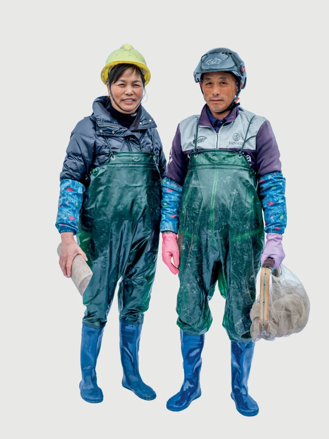 蛏苗养殖户陈邦朋、贾荷香夫妇,工具:刮苗器和淌苗袋