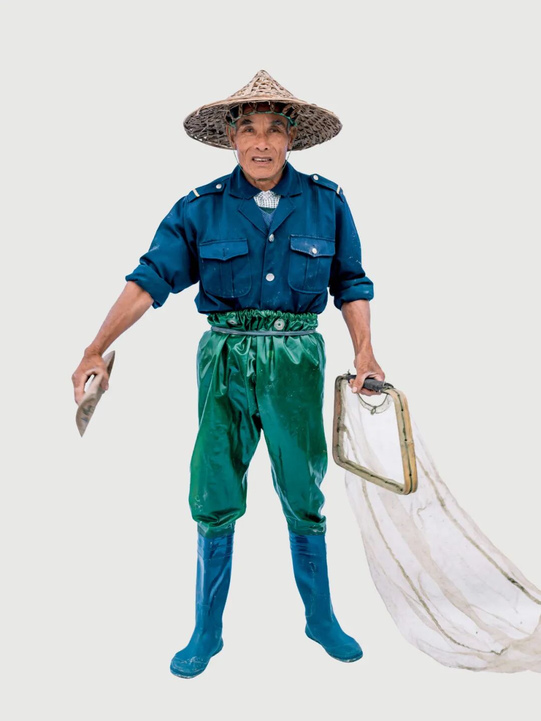 渔民卢法柱,工具:刮苗器和淌苗袋
