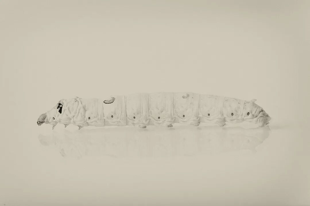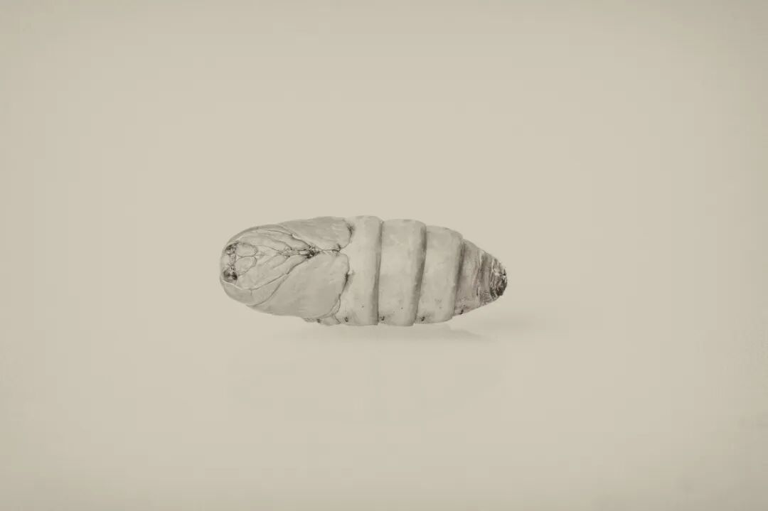 作品拍摄的对象是蚕宝宝,从蚁蚕、熟蚕、蚕蛹、蚕蛾、产卵的过程,这是一段奇妙的生命体验。这次创作,拍摄要求并不高,用了室内单灯布光和微距,现在回想起来,还是意犹未尽和惊心动魄。意犹未尽的是在养蚕的过程中,能看到它们每一个生命阶段不一样的生活特征,要蜕皮时一动不动,要结茧时身体发亮到处吐丝,有天晚上看着一只蚕宝宝用“八字摇头法”把自己慢慢淹没在茧衣之中,从凌晨一直守到天亮。惊心动魄的是某天突然缺少了口粮,于是到小区遍地寻找桑叶,在绿化带里找了一颗野桑树,摘了几片叶子回去喂食,结果一些蚕宝宝口吐黑水一直抽搐,立马在网上寻方,又驱车前往老家寻找新鲜桑叶,经过一段时日的守候和揪心,它们终于逐渐恢复,对此内心还纠结了许久。之后,又目睹了破茧、交尾、死亡,似乎在它们身上看到了我们个体生存的共同。