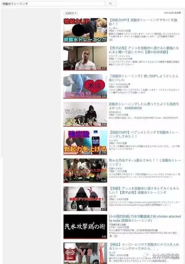 不过,似乎用碳酸水泡丁丁好像确实有新鲜的体验,因为在油管上检索关键词“炭酸水トレーニング”,你会找到4000多个相关视频……