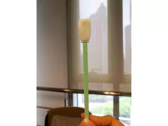 把口腔拭子拿出来,咧开嘴,用拭子擦拭上牙龈,从最左边到最右边,来回往复,大概5、6秒搞定,然后用试子的另一面擦拭下牙龈。