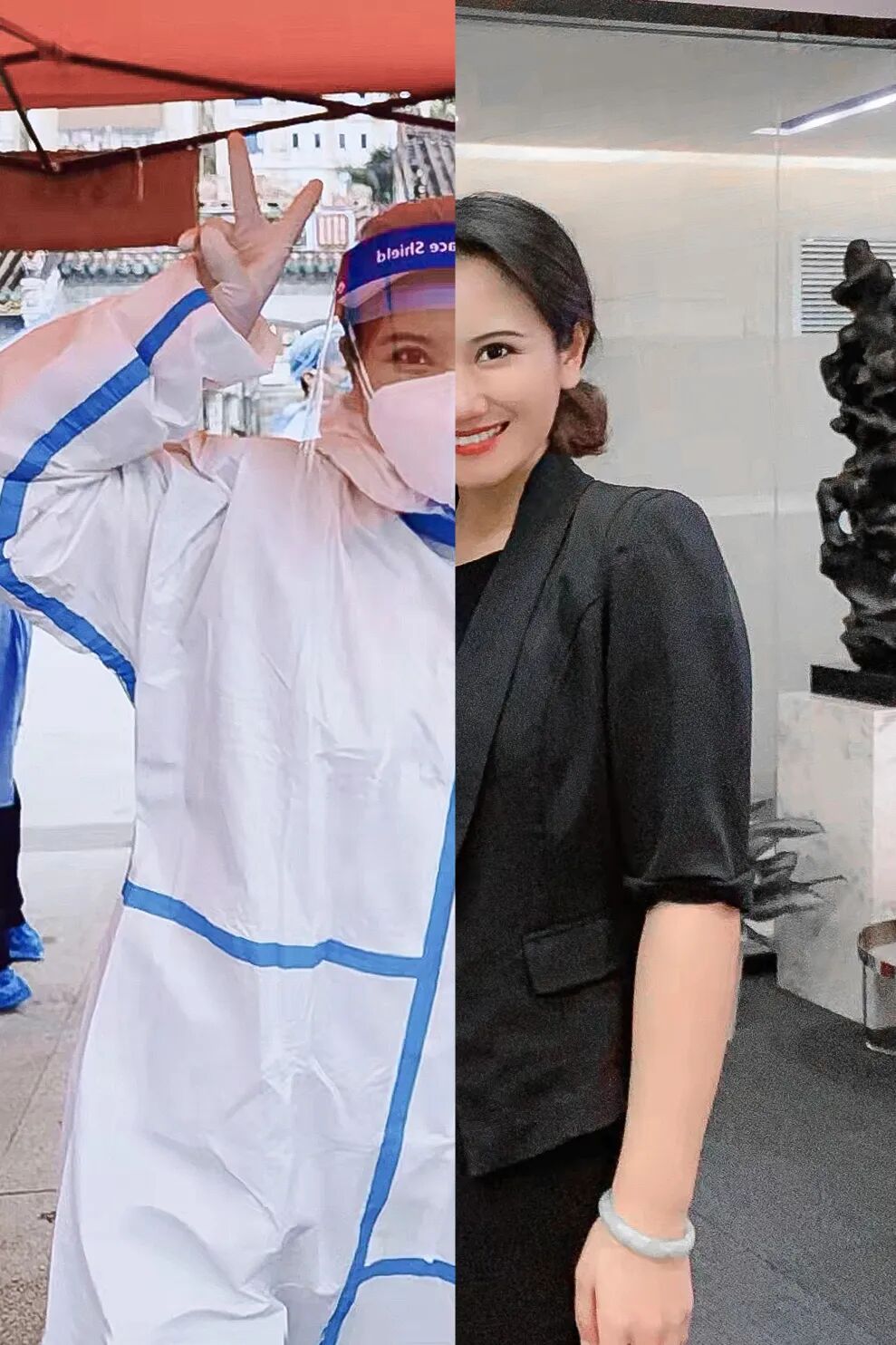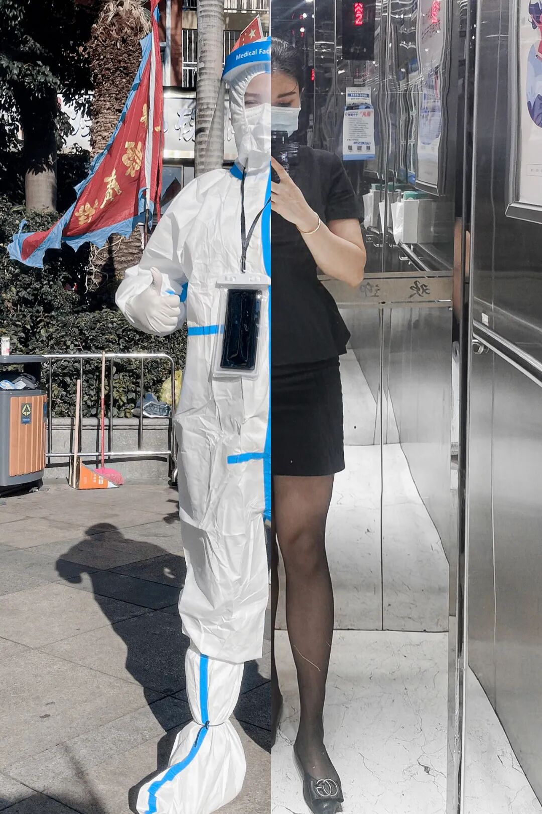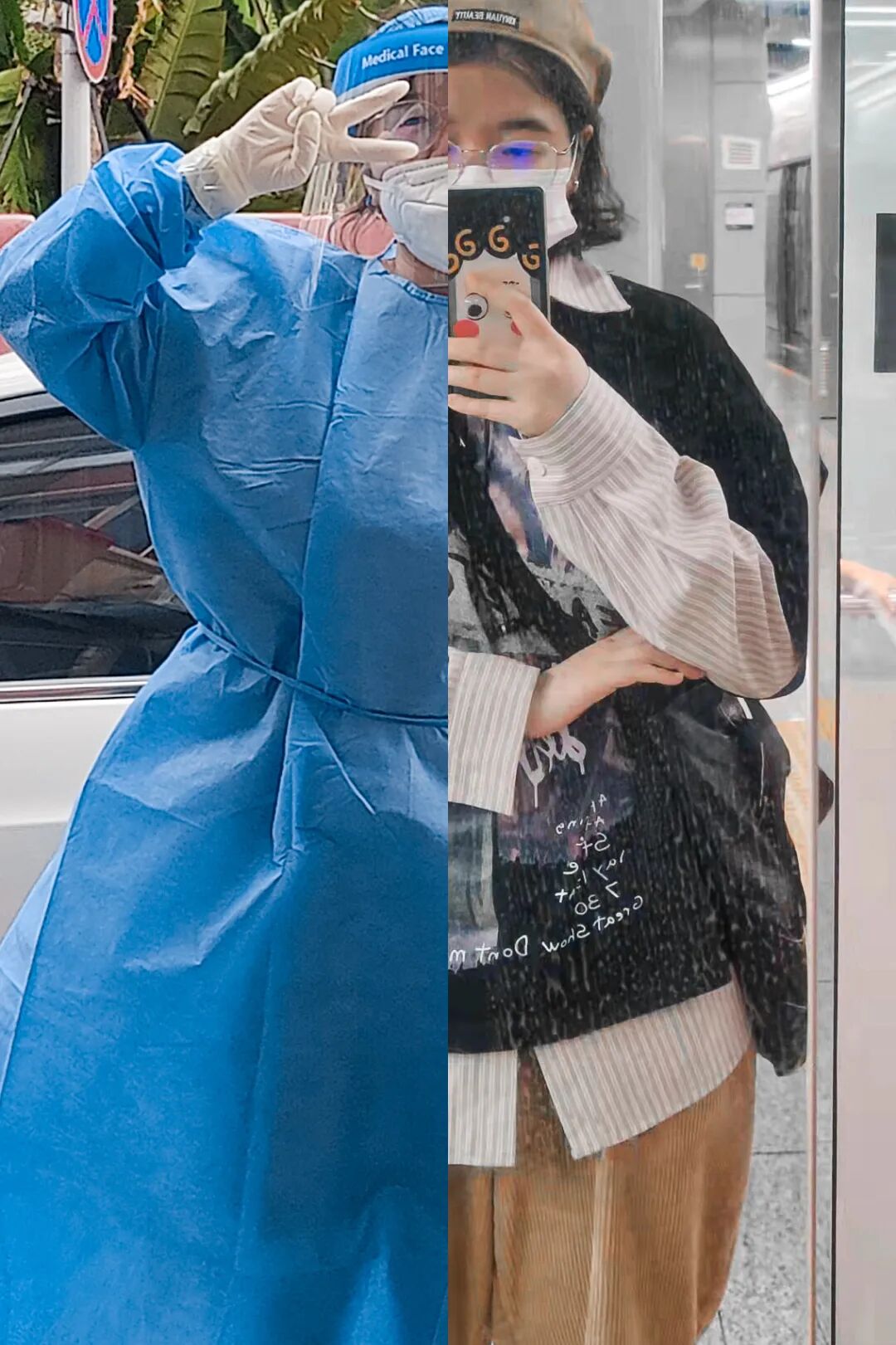 这是在社交媒体上看到的一位“大白”分享的日常,配了两张图,分别是身穿防护服、戴着口罩的“大白”工作照,裹得严严实实只露出眼睛;以及一张身着便装的日常照,妆容精致。