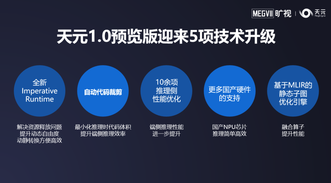 随后,天元MegEngine不断更迭,从3月的Alpha版本升级到6月的Beta版本、到9月的1.0预览版本,期间经历了8次迭代。从开源到现在经过半年的技术迭代,天元拥有三大核心优势:训练推理一体、全平台高效支持、动静结合的训练能力。