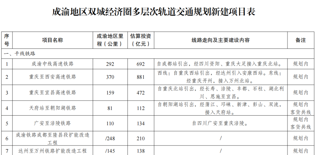 其中,《成渝地区双城经济圈多层次轨道交通规划新建项目表》中明确,建设的干线铁路包括:成渝中线高速铁路、重庆至西安高速铁路、重庆至宜昌高速铁路、天府站至朝阳湖铁路、广安至涪陵铁路、成渝铁路成都至隆昌段扩能改造工程、达州至万州铁路扩能改造工程、珙县至叙永铁路、南充至广安铁路、重庆至贵阳高铁。