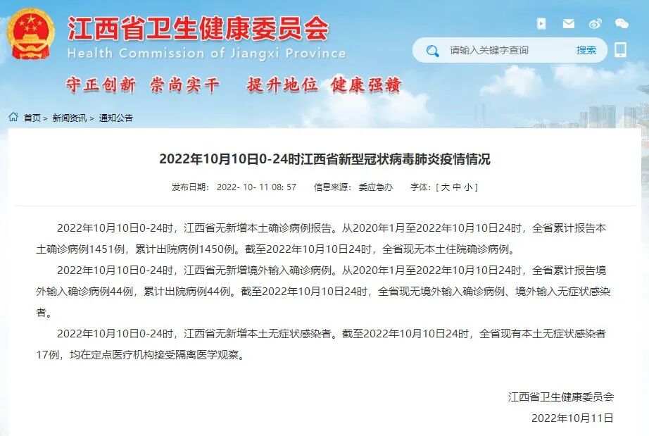 2022年10月10日0-24时,江西省无新增本土确诊病例报告。从2020年1月至2022年10月10日24时,全省累计报告本土确诊病例1451例,累计出院病例1450例。截至2022年10月10日24时,全省现无本土住院确诊病例。