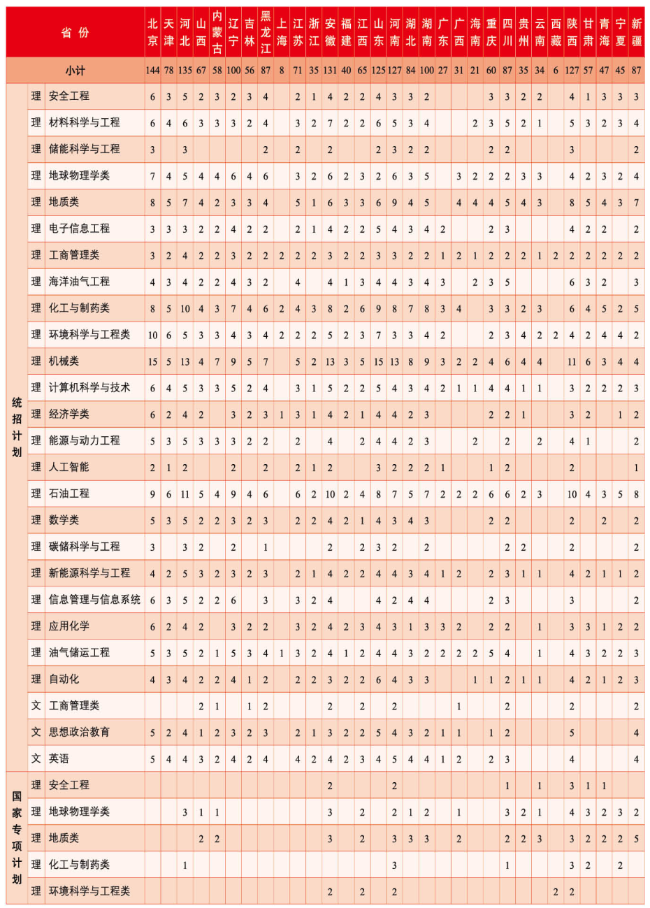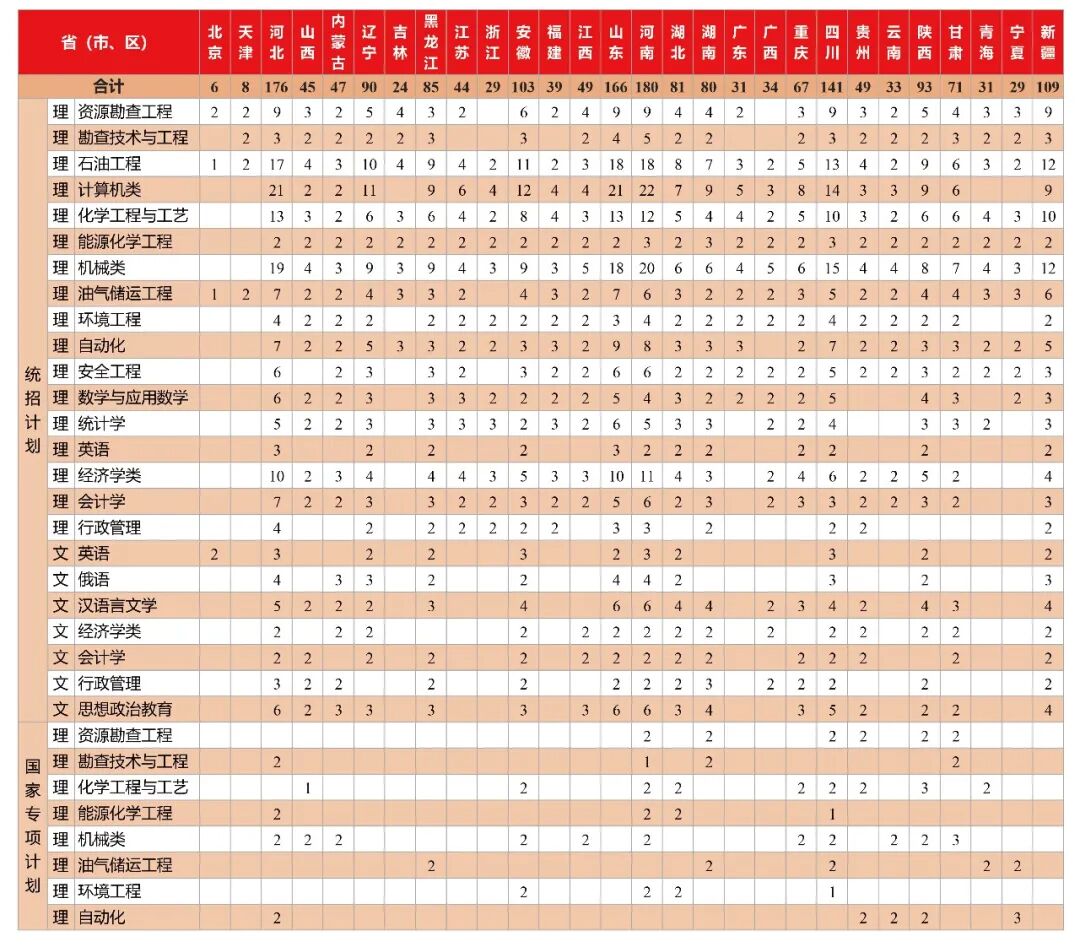 注:新疆“国家专项计划”含5个南疆计划,专业为地质类;高考综合改革省份不分文理;此表仅供参考,以教育部最终公布的计划数为准。