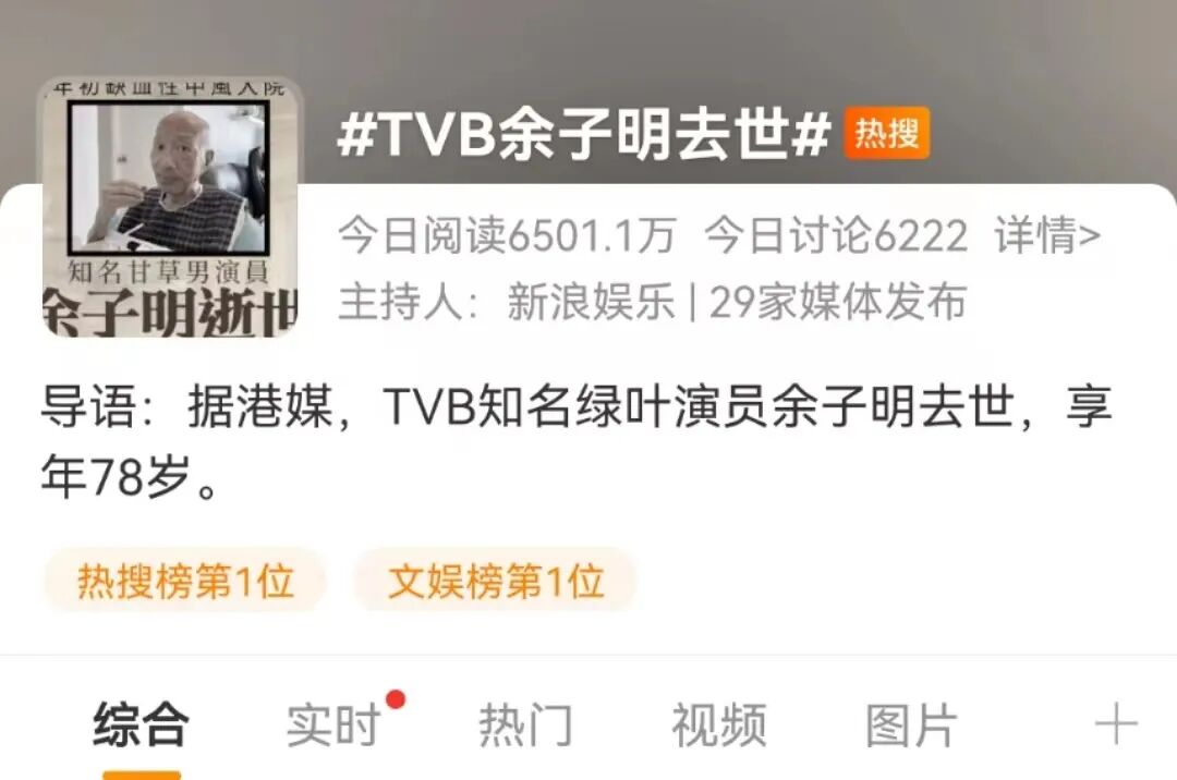 据报道,TVB知名绿叶演员余子明去世,享年78岁。