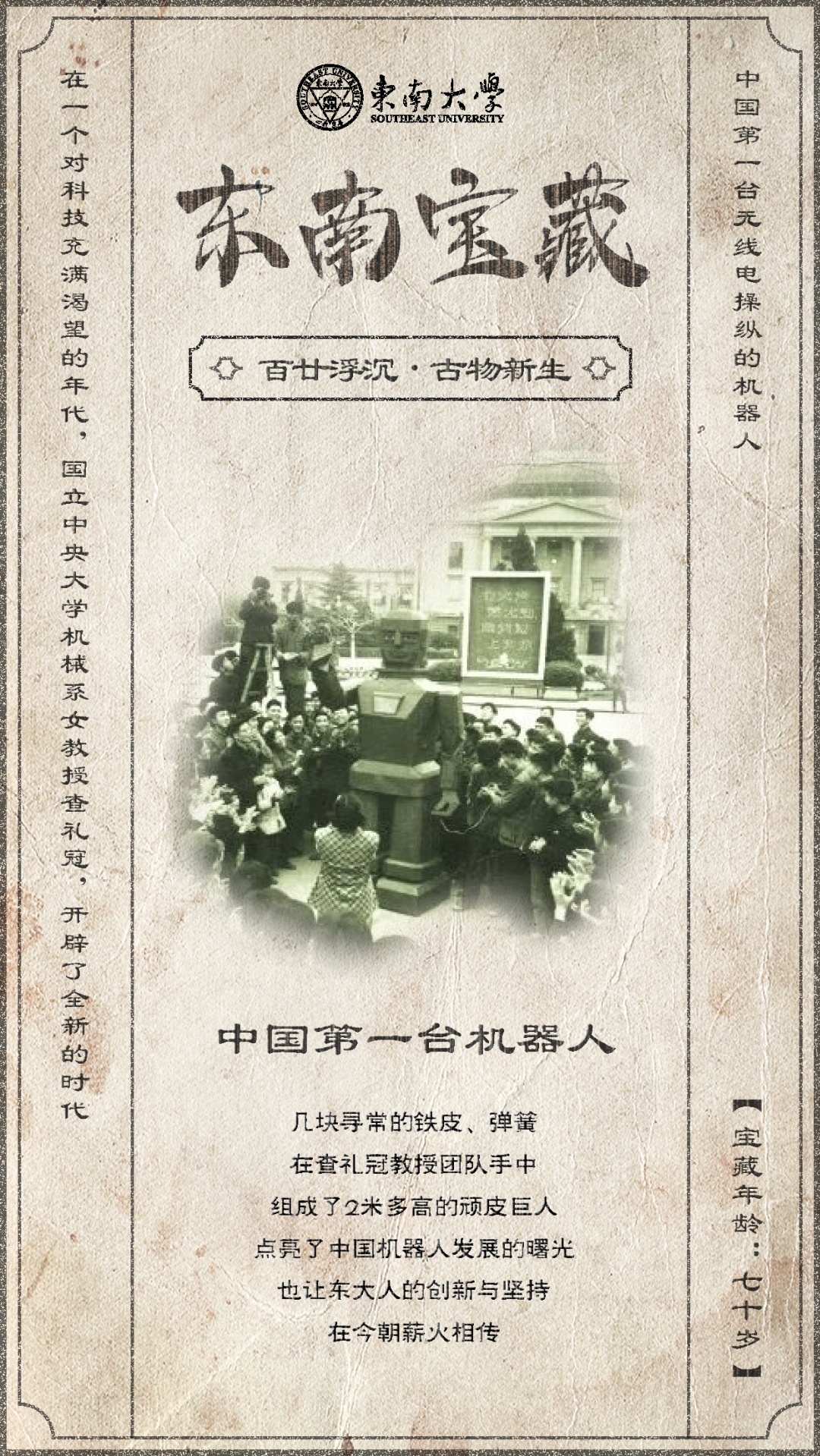 但在短短6天时间内,以查礼冠为首的30余师生就完成了250张设计图,讨论修改无数遍,才将机器人设计好。他们走遍南京城搜集材料,最终打造出了高度超过2米,能做28个自由度动作的铁皮“巨人”,展现出东大人的创造力与坚韧的精神。