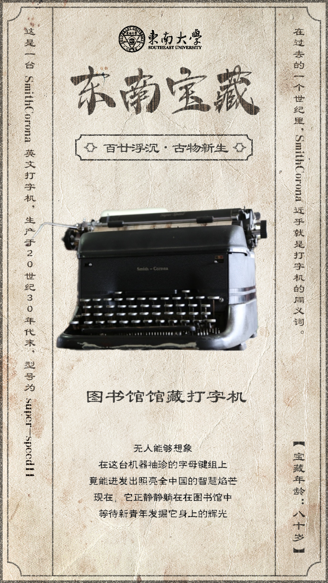 上世纪20年代出版的一本《图书馆简说》中写道,笔墨信笺等普通文具外,还应有“分类参考书……岁月图章、橡皮凹凸印、书签、装订具、打字机”等。1931年出版的《国立中央大学图书馆概况》一文中记载,当时图书馆有编目室两间,内有“办公桌九,书架十四,打字台三,大目录柜二,小目录箱二”;庋藏室即现在的典藏办公室也有两间,各有一张打字台,另外期刊储藏室内也有一张打字台。几台小小的打字机,见证着东大百廿文脉的传承。