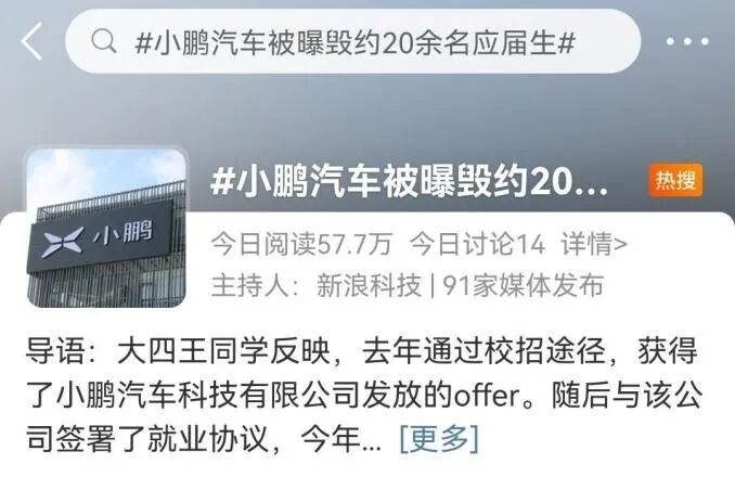 微博平台小鹏汽车毁约应届生热搜/燃财经截图