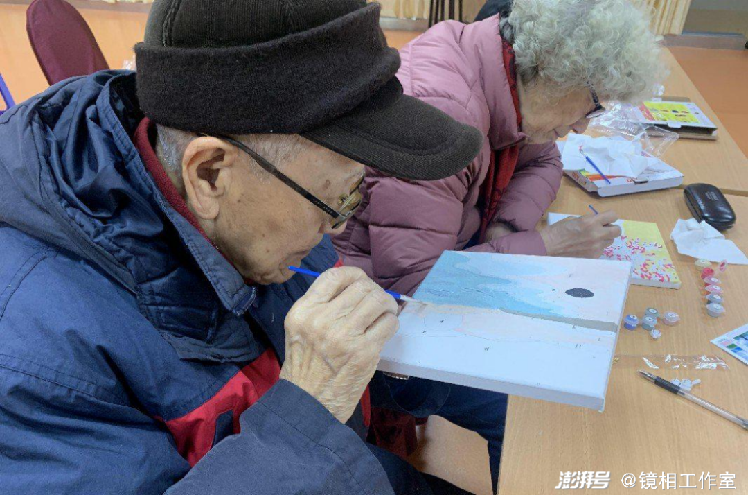 陪老人家欢度春节是我们与老人拉近距离、彼此熟落的好契机,也因此更真切地体会到老人身上的生命力,以及陪伴对他们的意义。90岁高龄、双眼视力只有0.1的张建明,手捧画板贴近厚厚的镜片、一点点仔细地用笔描着数字画。他是全场完成度最高的,但他却很不在乎这幅作品,我悄悄把它拿回家收藏。