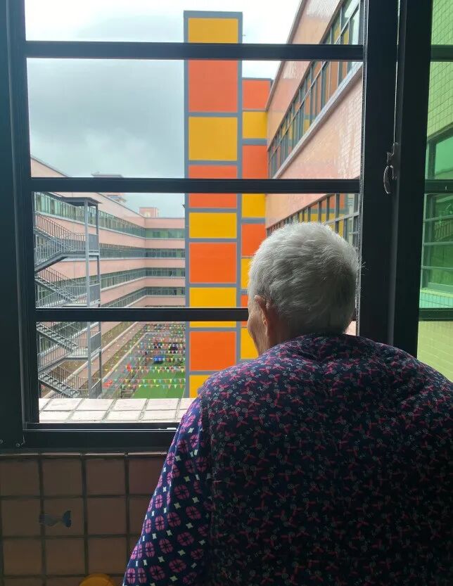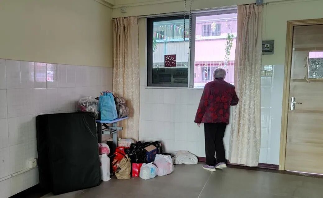 章萍摇着头说这话时,我才注意到她那枯干脸上的皱纹、苍白的嘴唇和凹陷的眼窝,想起她已93岁。初见她时,她穿一双皮靴,走路还算稳健。相比这里许多年龄比她小的老人,她的健康状况要好得多。在这里,老人们被贴上的最基础的“标签”,通常是关于健康状况的——“失能”“失智”或“自理”。在养老院待了近一个月,我们的第一反应是下判断:这是一位自理老人。但身体上能够自理不代表对生活也拥有同样的掌控力,至少在选择居所这一点上,总由不得章萍自己。“烦得很,住得好好的,又要搬。”2月9日这天,章萍异常焦躁不安。由于院里楼层调整,她需要从三楼搬上四楼。她不喜欢麻烦护理员,也不放心让别人收拾,知道要搬“家”后,自己一点一点将东西拿出来包成一团团,大大小小十几个包裹堆满了房间里的两张床——这是她全部的“家当”。她对于新房间的顾虑有两点——一是怕不能看到幼儿园,二是怕跟“神经病”住一起。学习幼儿教育出身的董事长严敏,一直想做一个老幼共托的社区,在申办养老院约两年后,于2021年2月在一旁开办了幼儿园。老人和孩子常一起升国旗、做游戏,开展各种形式的互动。但疫情爆发以来,幼儿园和养老院只能分开活动。去年入住的章萍没能碰上与孩子互动的机会,但她房子的窗户正对着楼下幼儿园,她很喜欢站在窗边往下望,有时候搬个凳子在那儿,站累了,就坐着。曾有一次,她发现楼下有个孩子与自己的重孙长得很像,她忙打电话给孙子,问电话那头6岁的重孙:“你想没想太奶奶?”电话里传来稚嫩清脆的声音——“想”。章萍口中的“神经病”,是指失能失智老人。据班长介绍,三楼能交流的老人大概有三位,章萍便是其中之一。她刚到养老院时,曾与一位失能老人同住,每到换尿裤的时候,“那个味道受不了”,即便是晚上,她也要往房间外面跑。“要是分到跟‘神经病’一起住,我就出去,打滴滴去市政府!”或许这是她一时的气话,或许她真这样考虑过。但至少现在,这只是她与自己的抗争,愤怒而绝望的抗争。她已经不是第一次被安排着搬“家”,每次总是以她的接受终结。章萍的老家在三百多公里外的梅州。老伴离世后,小儿子打电话劝她:“妈,现在全部都走了,你一个人在家里干啥嘛?以前你种东西卖了供我们上学,现在我们一个个都大学毕业出来了。你还种啥,不种了,你出来。”章萍就出来了,到了深圳。2021年4月底,章萍几经周折,被儿女们安排住进福寿园。