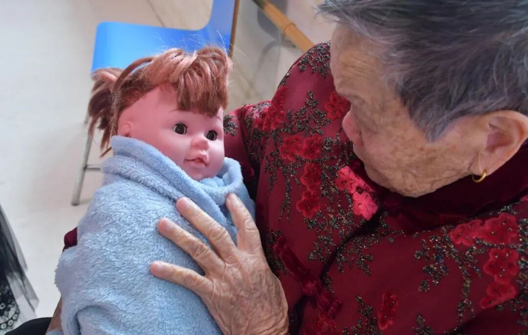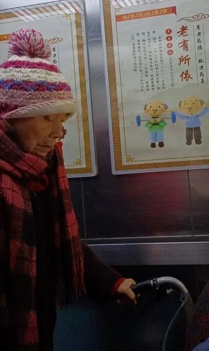 离开养老院的那天,我们见到了许久未见的邓晓虹。春节期间,她被孩子接了回去,由于疫情,在家待了15天才回到院里。我们见到她时,护理员正准备带她去楼下:“晓虹,我们走。”邓晓虹垂着头,没有应答,表情神态也没有一丝变化,看上去有些木讷。她呆呆地走着,行动很缓慢,失去了往日的活力与“生气”,就像一个“机器人”。尽管邓晓虹有认知障碍,但在我们的印象中,她非常活泼好动,是一个“坐不住”的人,好像对一切事物都充满了好奇。我们见过她对着镜子捣腾,围着镜子绕来绕去,似是在研究镜子里的自己;我们见过她看着房间里的时钟,忽然就伸出手在空气中试图去“逆转”正跳动的秒针;我们也见过她在活动中途跑到墙角,弯着腰抠地板,把贴在地上的纸抠了下来。眼前巨大的反差冲击着我们,愣了好一会儿,我们才缓过神来,要不是那身着装,我们差点没认出她来。