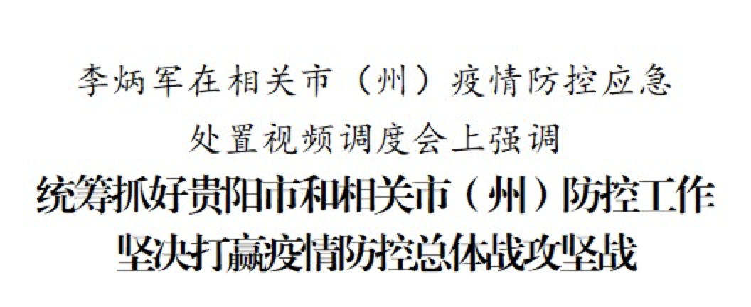 9月8日,省委副书记、省长李炳军主持召开相关市(州)疫情防控应急处置视频调度会。他强调,要深入贯彻习近平总书记关于疫情防控工作的重要指示精神,全面落实党中央、国务院和省委、省政府决策部署,统筹抓好贵阳市和相关市(州)防控工作,坚决打赢疫情防控总体战、攻坚战,尽早实现全省社会面清零,以实际行动迎接党的二十大胜利召开。省领导吴强、吴胜华、陶长海、郭瑞民在省主会场或分会场参加。