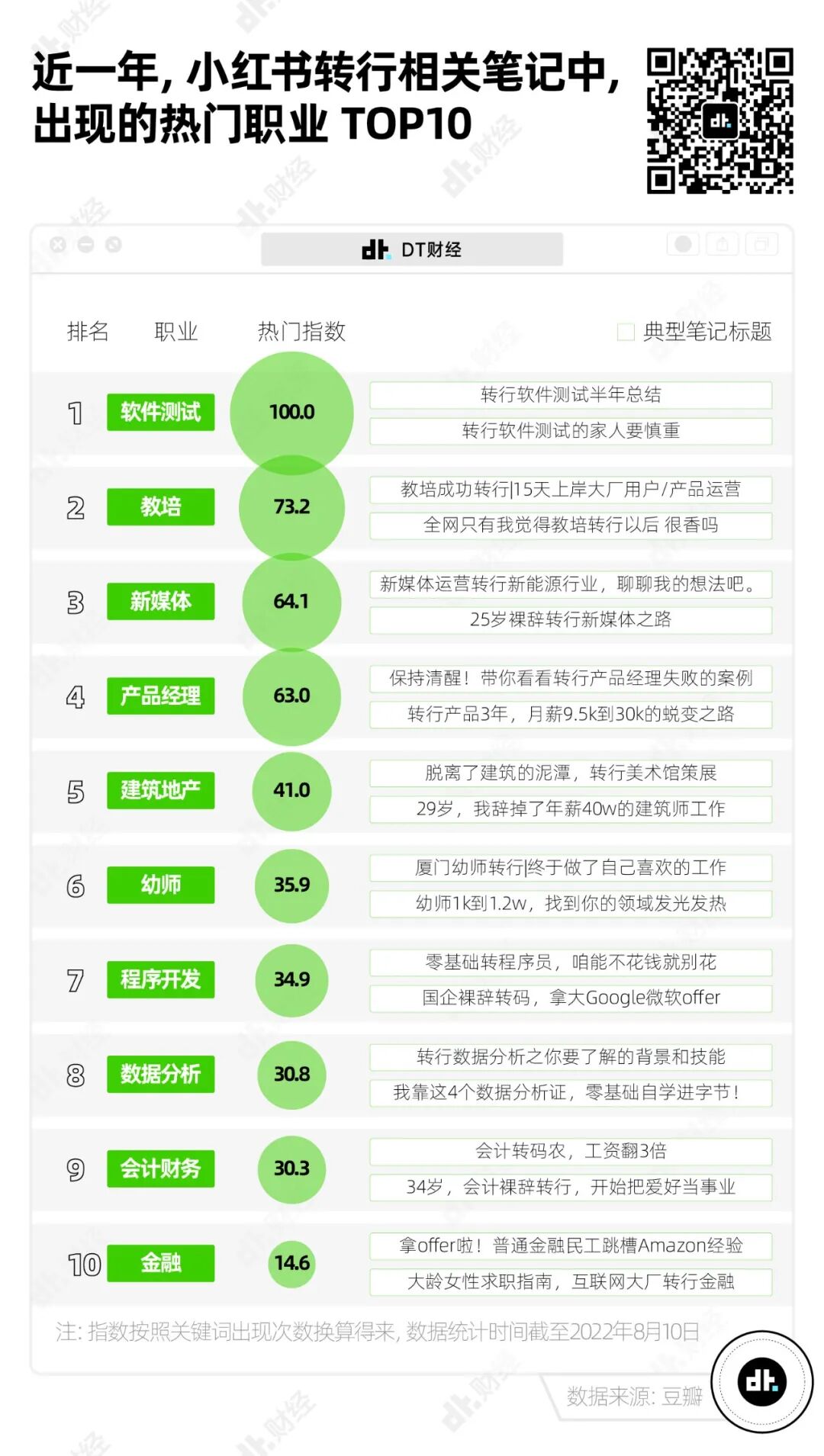 小红书一年内“转行”相关笔记有近1.3万条,与之相关热门职业有测试、教培、新媒体、产品经理等。
