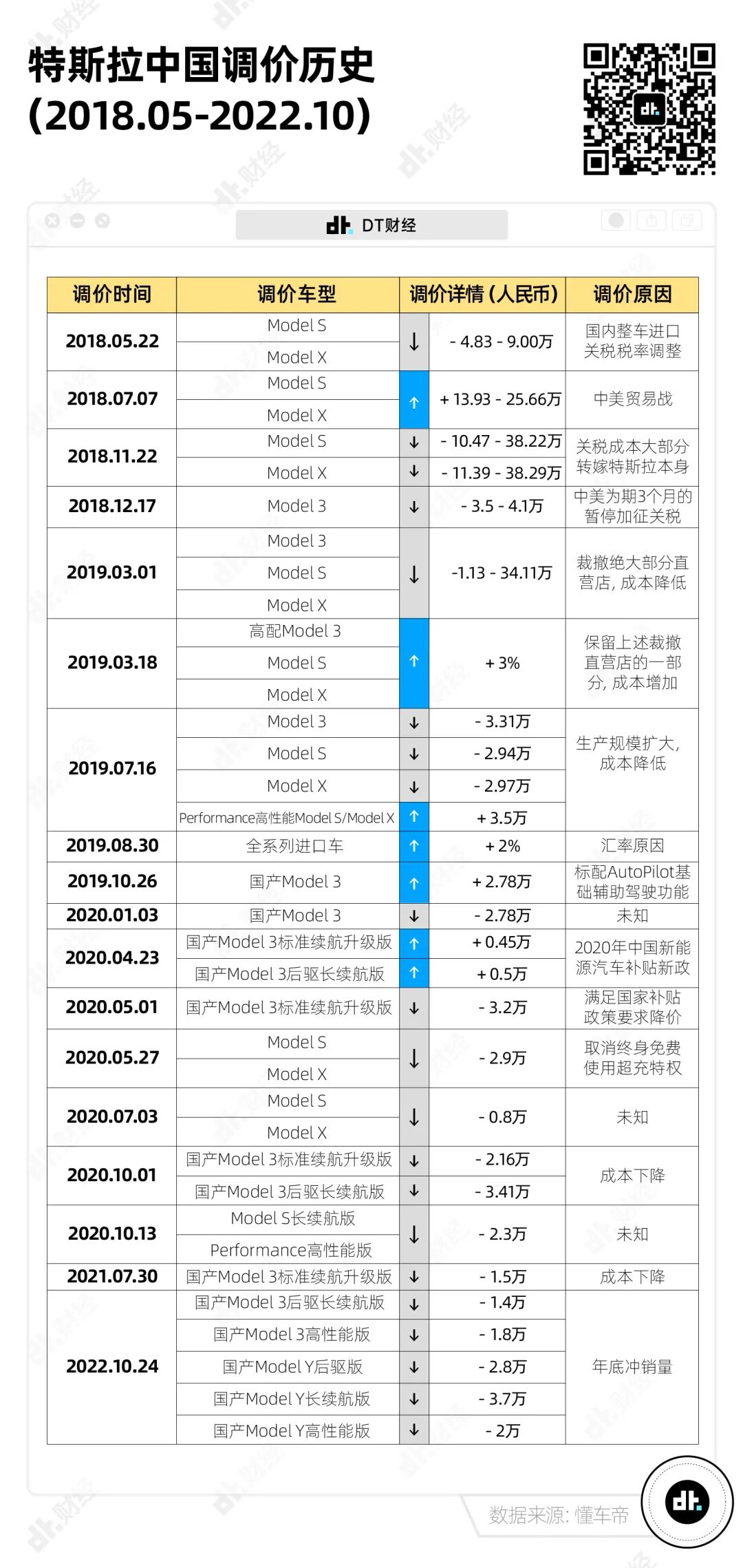 以特斯拉中国为例:自2018年5月至2022年10月,特斯拉各个车型调价共计18次。