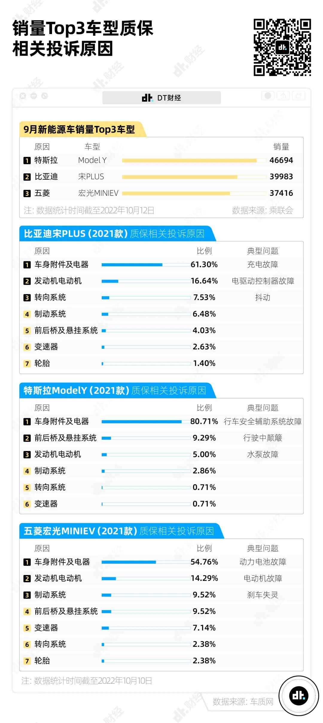 车质网数据显示,9月销量最好的三个车型质量相关投诉TOP1都是“车身附件及电器”,相关问题包括充电故障、动力电池故障、行车安全辅助系统故障等。