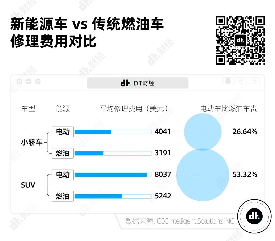 咨询公司统计,在紧凑小轿车的车型中,新能源车比传统燃油车的平均维修价格要高26.6%。而SUV的差价更高:新能源SUV维修费用平均比传统燃油车贵53.3%,即燃油车维修费用的一半以上。