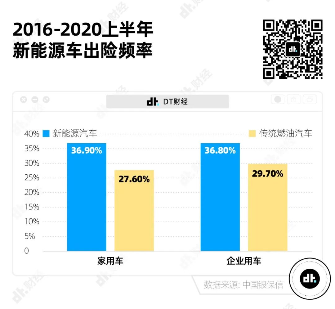 中国银保信数据显示,2016年到2020年上半年,新能源汽车整体出险频率高于非新能源汽车3.6%,家用车新能源汽车的出险率更是高于非新能源车9.3%。并且,家用新能源车型的按均赔款(平均每台车赔付金额)也高于非新能源汽车2.7%。
