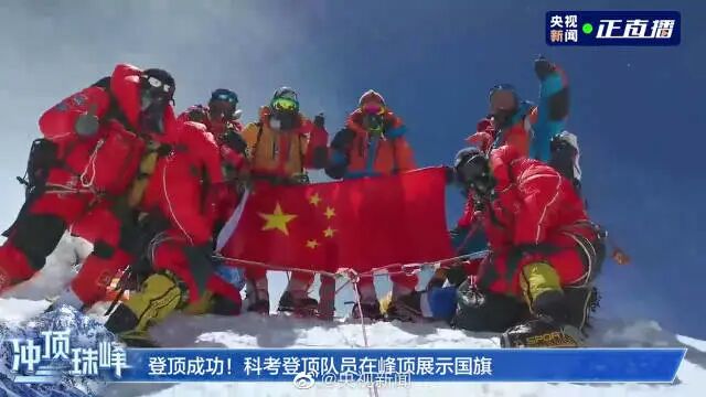 5月,“巅峰使命2022”珠峰科考登顶队员在珠峰峰顶展示五星红旗。![]()